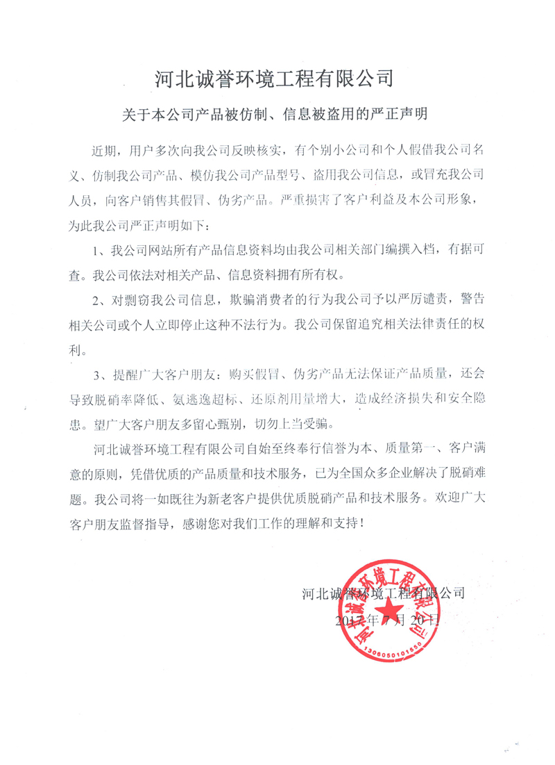 3、提醒廣大客戶朋友:購買假冒、偽劣產(chǎn)品無法保證產(chǎn)品質(zhì)量,還會導(dǎo)致脫硝率降低、氨逃逸超標(biāo)、還原劑用量增大,造成經(jīng)濟(jì)損失和安全隱患。望廣大客戶朋友多留心甄別,切勿上當(dāng)受騙。