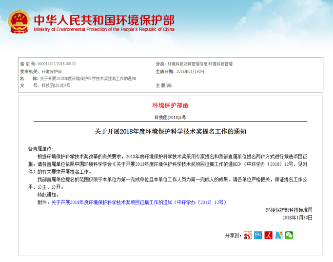 關于開展2018年度環(huán)境保護科學技術獎項目征集工作的通知