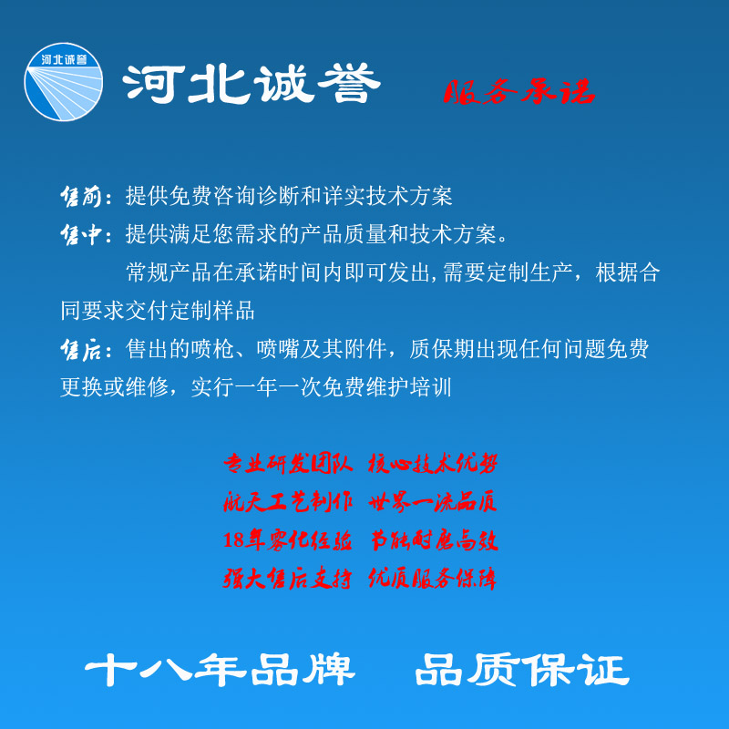(2)增濕塔噴槍選用規(guī)范不銹鋼及耐磨合金,通過特殊加工工藝制成,具有耐酸、耐堿、耐高溫、耐磨損,使用壽命更長等特點。其霧化角度從30-110度,流量從110kg/h到1600kg/h,可滿足各種規(guī)劃生產(chǎn)線的需求。